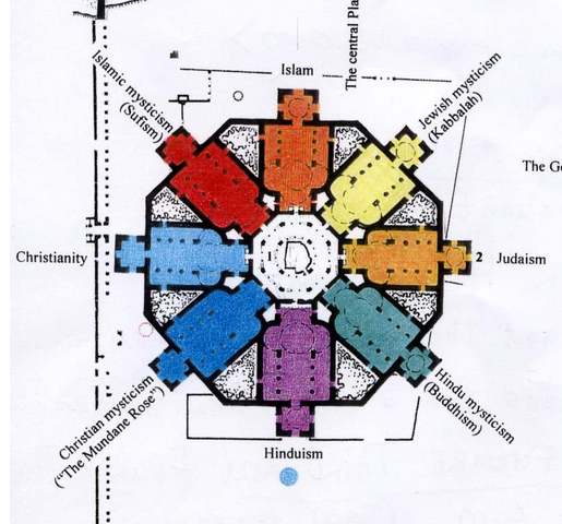 Notice how the wings of the building are dedicated to different faiths, and they lead to a central worship point..a visual illustration to their belief that all paths lead to God. The number of sides of the building is the same as the Bahá'í Faith.